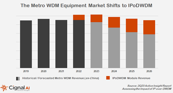 ICC訊(編譯:Nina)根據(jù)Cignal AI最新的IPoDWDM影響報告,城域WDM設(shè)備支出將很快被路由器中使用的可插拔光學(xué)器件所顛覆。IPoDWDM是一個有著20年歷史的概念,但新的因素,如400ZR的出現(xiàn)、架構(gòu)上不斷進步的超大規(guī)模網(wǎng)絡(luò)運營商,以及不斷變化的流量和網(wǎng)絡(luò)管理趨勢,將在2026年催化該技術(shù)的廣泛部署。