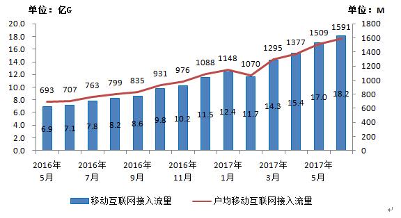 圖8 2016-2017年6月當(dāng)月移動互聯(lián)網(wǎng)接入流量和戶均流量比較