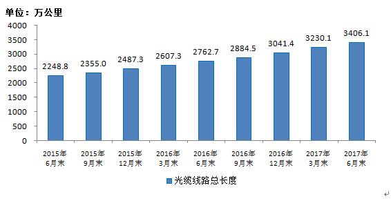 圖11 2015-2017年6月光纜線路總長度發(fā)展情況