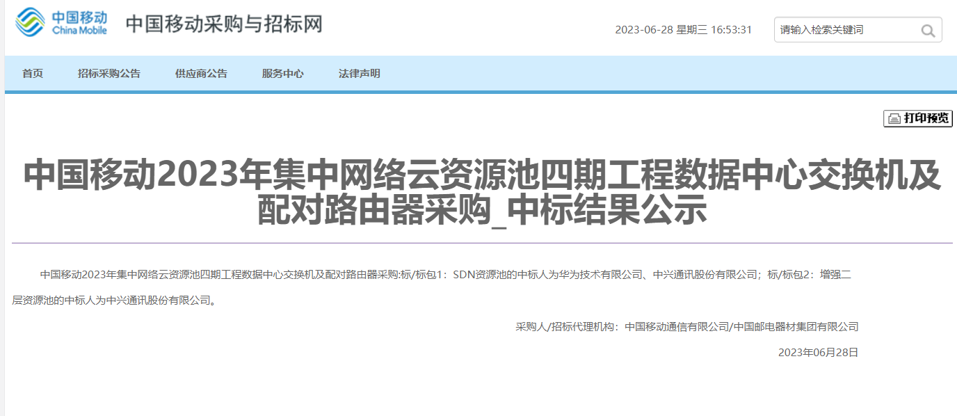 ICC訊 6月28日,從中國(guó)移動(dòng)采購(gòu)與招標(biāo)網(wǎng)獲悉,中國(guó)移動(dòng)公示了2023年集中網(wǎng)絡(luò)云資源池四期工程數(shù)據(jù)中心交換機(jī)及配對(duì)路由器采購(gòu)的采購(gòu)結(jié)果,SDN資源池的中標(biāo)人為華為、中興兩家包攬,增強(qiáng)二層資源池的中標(biāo)人為中興。