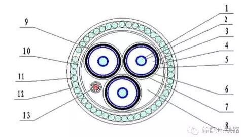 光纖復(fù)合高壓電纜的使用也是一種發(fā)展趨勢,現(xiàn)在的海底電纜基本都是采用光纖復(fù)合高壓電纜,現(xiàn)在陸纜使用光纖復(fù)合高壓電纜也越來越多。下圖的35kV海纜圖截面圖。