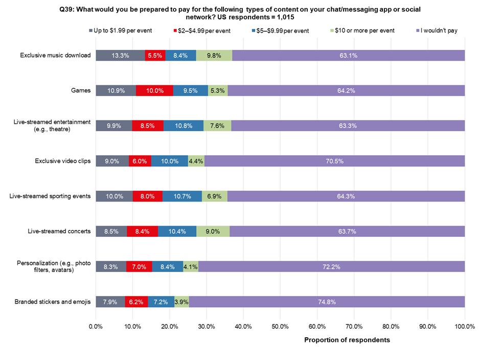 Ovum最近發(fā)布的數(shù)字消費(fèi)者洞察2018年:通信和媒體報(bào)告的數(shù)據(jù)顯示,消費(fèi)者非常反對(duì)在社交媒體或聊天/消息應(yīng)用上對(duì)任何類(lèi)型的內(nèi)容進(jìn)行支付。消費(fèi)者甚至表示,他們不會(huì)為社交和通訊應(yīng)用程序上的體育賽事直播等高端娛樂(lè)活動(dòng)內(nèi)容付費(fèi),這種內(nèi)容類(lèi)型在付費(fèi)電視等傳統(tǒng)平臺(tái)上往往定價(jià)很高。