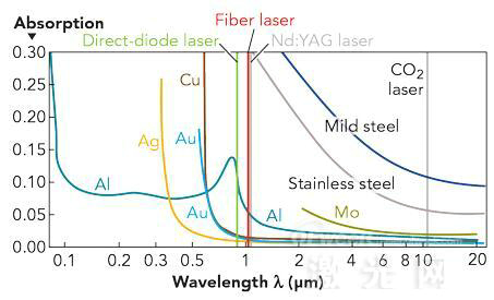 過去10年間,光纖激光器之所以逐步取代CO2激光器,最主要原因是在同等功率水平下,光纖激光器的切割速度是CO2激光器的2到3倍。相較于10.6μm波長的CO2激光器,大多數(shù)金屬材料對于1.08μm波長具有更高的波長吸收率也能說明這一點(diǎn)。如圖1所示:
