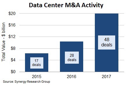 2017年全球大型數(shù)據(jù)中心并購(gòu)交易價(jià)值達(dá)200億美元