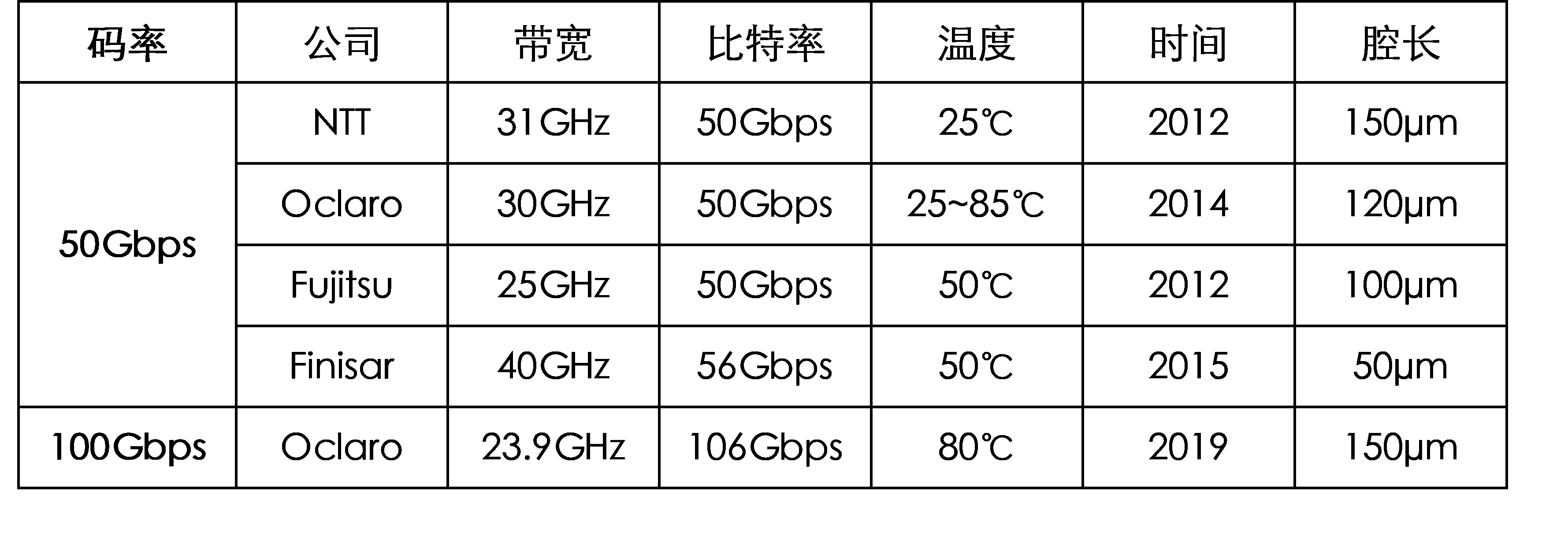 潘彥廷博士表示,直調(diào)激光器的設(shè)計(jì)瓶頸在于載子密度不均進(jìn)而引發(fā)光電信號(hào)高速調(diào)制上的問(wèn)題,因此在信號(hào)傳輸過(guò)程中會(huì)出現(xiàn)過(guò)沖、抖動(dòng)、延遲、啁啾等等的情況。在國(guó)際研討會(huì)論文的高速光芯片發(fā)表歷程,2012年NTT首次提出了50Gbit/s直調(diào)激光器,在25℃帶寬達(dá)到31GHz,利用降低寄生電容的BCB的設(shè)計(jì)。同年Fujitsu也發(fā)表25GHz帶寬,50Gbit/s直調(diào)激光器在50℃下操作,接著2014年Oclaro發(fā)表了50Gbs 直調(diào)激光器賦予其在25~85℃更寬溫條件下使用。2015年Finisar發(fā)表高帶寬40GHz激光器,操作在50℃下可達(dá)50Gbit/s。 2019年Oclaro更推出的106Gbps激光器,溫度可操作在80℃,以上的高速產(chǎn)品基本特性表現(xiàn)已經(jīng)非常優(yōu)異,下一步需要考量的是商用化后的可靠性議題。
