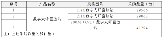 其中,1.8G數(shù)字光纖直放站采購數(shù)量為29566臺(tái),2.1G數(shù)字光纖直放站采購數(shù)量為29063臺(tái),800M(C/L)數(shù)字光纖直放站采購數(shù)量為41294臺(tái)。數(shù)量需以實(shí)際采購為準(zhǔn)。