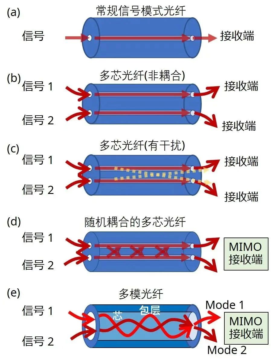 當(dāng)一個光信號在光纖的芯部傳播時,它以各種振動狀態(tài)傳播,同時在芯部和包層的邊界處重復(fù)全反射(圖1e)。這些不同的振動狀態(tài)就是傳播模式。多模光纖有一個大的纖芯直徑,在一個纖芯內(nèi)存在多種模式。在多模光纖的傳播、輸入/輸出和接續(xù)過程中會出現(xiàn)不同模式之間的信號干擾,這就需要使用MIMO數(shù)字信號處理*?來消除干擾。由于到達接收器之前的時間差,不同模式的信號需要優(yōu)化光纖和重載的數(shù)字信號處理。到目前為止,多模光纖傳輸最多可使用55種模式。