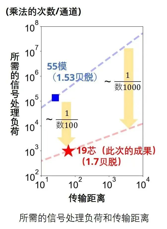 使用多模和耦合型多芯光纖進行傳輸,在進行模式分離時幾乎總是需要多輸入多輸出(MIMO)處理(為每個模式/芯分離成獨立的信號通道) MIMO 是一種信號處理技術(shù),在無線通信中用于消除多徑干擾。在光通信中,它被用來消除在同一光纖中傳播的不同光信號之間的干擾。MIMO處理的負(fù)荷(功耗)主要由乘法的次數(shù)決定,并與模式數(shù)的平方和濾波器函數(shù)的長度成正比,用于反向再生信號在光纖中傳播的影響。在多模光纖傳輸中,濾波函數(shù)的長度取決于每個模式的傳播速度差,而傳播速度差通常與光纖長度成比例累積,導(dǎo)致長距離傳輸?shù)男盘柼幚碡?fù)荷很大。在耦合的多芯光纖傳輸中,每個空間通道(芯)的傳播特性都是均勻的,濾波函數(shù)的長度與傳輸距離的二分之一功率成正比。當(dāng)在10,000公里的傳輸距離上進行比較時,這是一個跨洋級的傳輸距離,與55模式傳輸相比,耦合的19芯系統(tǒng)可以將每個信道的MIMO處理負(fù)荷減少多達幾千倍。(圖2)