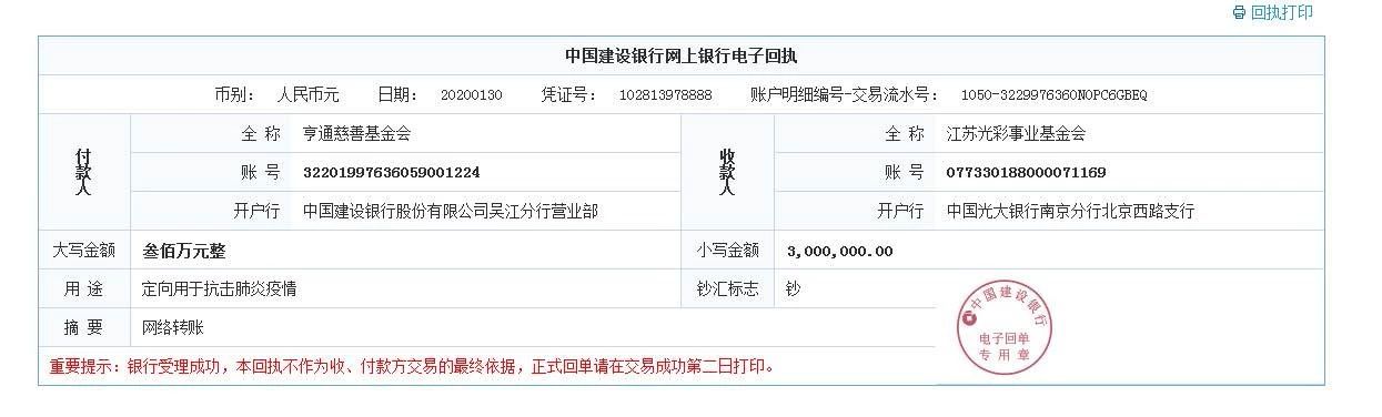為積極響應(yīng)全國(guó)工商聯(lián)、江蘇省工商聯(lián)就新型冠狀病毒感染肺炎疫情發(fā)出的號(hào)召,亨通集團(tuán)向江蘇省光彩事業(yè)基金會(huì)捐贈(zèng)300萬元,弘揚(yáng)光彩事業(yè)精神,支援疫區(qū)打贏疫情防控阻擊戰(zhàn)。
