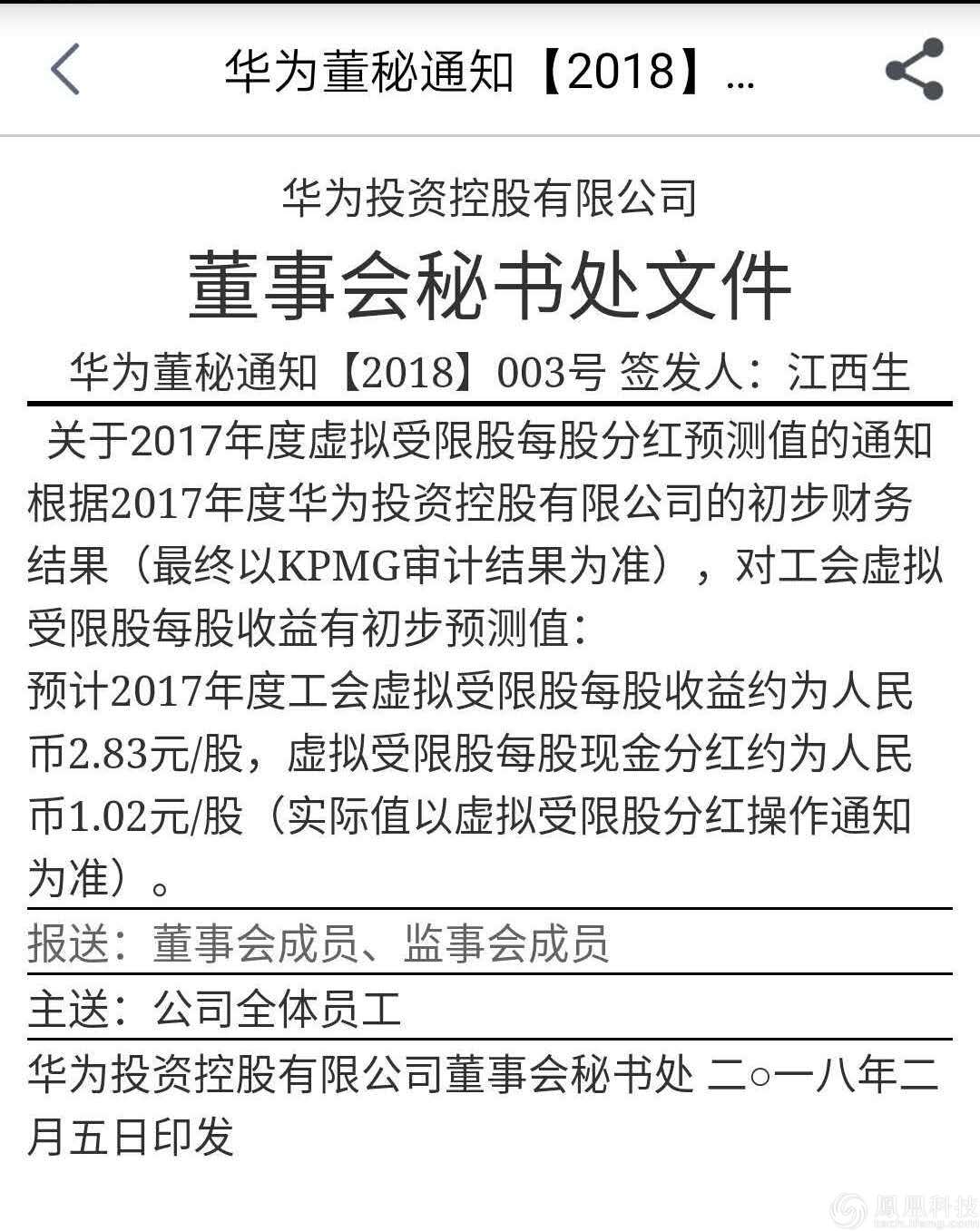 ICCSZ訊 近日從華為內(nèi)部獲悉華為2017年虛擬受限股分紅預(yù)測(cè)通知下發(fā)。發(fā)文顯示,2017年華為虛擬受限股每股預(yù)測(cè)收益為2.83元,預(yù)測(cè)現(xiàn)金分紅為1.02元/股。