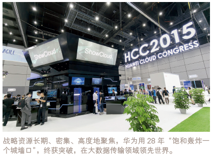 從創(chuàng)立至今,華為只在攻擊大數據傳送管道這個城墻口投入全部戰(zhàn)略資源。華為每年用500億元左右的研發(fā)投入,500億至600億元的市場和服務的投入,聚焦于管道,飽和攻擊,終于炸開了這個城墻,在大數據傳送技術上達到世界領先。在華為的戰(zhàn)略家眼中,隨著大數據越來越擴張,管道會像太平洋一樣粗。華為今天真正進入到了藍海市場,在管道領域已經全面領先,但華為還要持續(xù)密集地在管道戰(zhàn)略上加大投入。