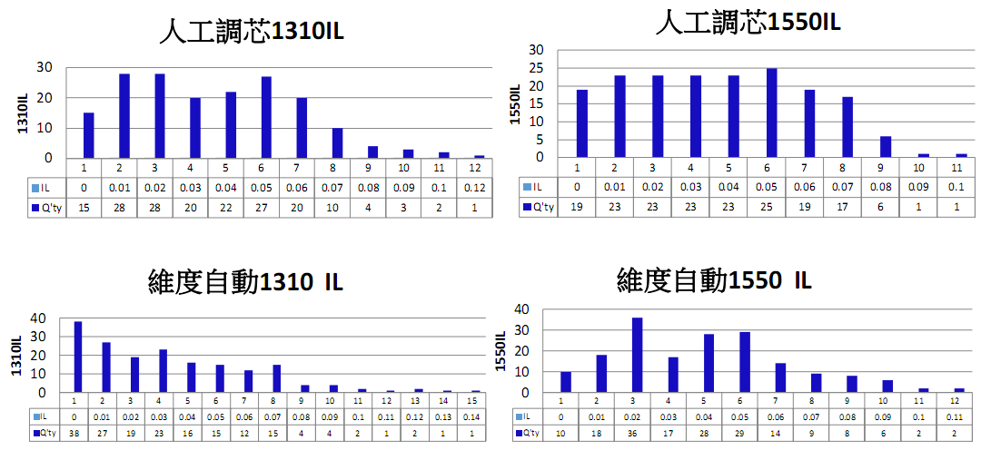 使用人工調(diào)芯與維度自動(dòng)機(jī)臺(tái),各選10條跳線進(jìn)行調(diào)K後互配測(cè)試IL,