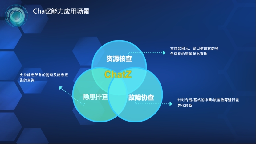 在傳統(tǒng)運(yùn)維環(huán)境下,運(yùn)維人員受限于繁瑣的菜單切換和低效的查詢(xún)定位,在應(yīng)對(duì)規(guī)模大、復(fù)雜度高的網(wǎng)絡(luò)維護(hù)任務(wù)時(shí),常常遇到故障定位難,問(wèn)題解決速度慢等挑戰(zhàn)。為解決上述問(wèn)題,中興通訊開(kāi)發(fā)了能夠理解用戶(hù)運(yùn)維意圖并具備資源核查、報(bào)障協(xié)查和隱患排查三大功能的交互對(duì)話(huà)式AI運(yùn)維機(jī)器人ChatZ。