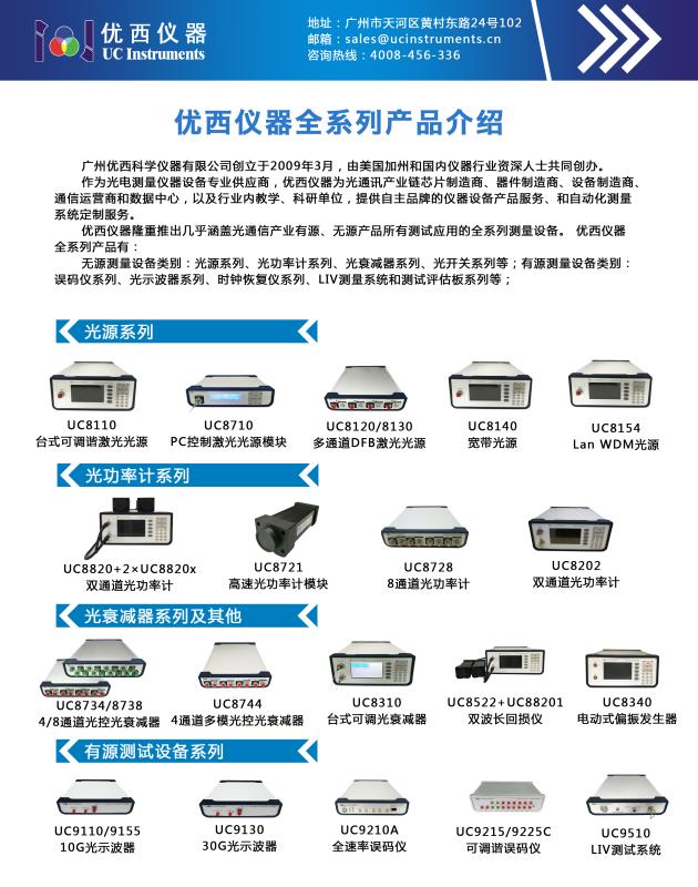 廣州優(yōu)西科學(xué)儀器有限公司創(chuàng)立于2009年3月,由美國(guó)加州和國(guó)內(nèi)儀器行業(yè)資深人士共同創(chuàng)辦。作為光電測(cè)量?jī)x器設(shè)備專業(yè)供應(yīng)商,優(yōu)西儀器為光通訊產(chǎn)業(yè)鏈芯片制造商、器件制造商、設(shè)備制造商、通信運(yùn)營(yíng)商和數(shù)據(jù)中心,以及行業(yè)內(nèi)教學(xué)、科研單位,提供自主品牌的儀器設(shè)備產(chǎn)品服務(wù)、和自動(dòng)化測(cè)量系統(tǒng)定制服務(wù)。