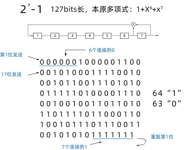 在圖中可以看到,PRBS7最長(zhǎng)是127bit(27-1), 理論上來說,7bit的2進(jìn)制碼,一共會(huì)有27個(gè)不同組合。但是如果碼流全部為‘0’的時(shí)候,經(jīng)過異或運(yùn)算,輸入到寄存器第一位的值還是0, 這樣移位寄存器將會(huì)一直輸出為零,移位寄存器被死鎖。所以PRBS碼流不能全部為零。另外,PRBS7 碼流中最長(zhǎng)的連續(xù)‘1’個(gè)數(shù)為7個(gè),最長(zhǎng)的連續(xù)‘0’個(gè)數(shù)為6個(gè)。127bit的連續(xù)碼流中,一共有64個(gè)‘1’,63個(gè)‘0’。