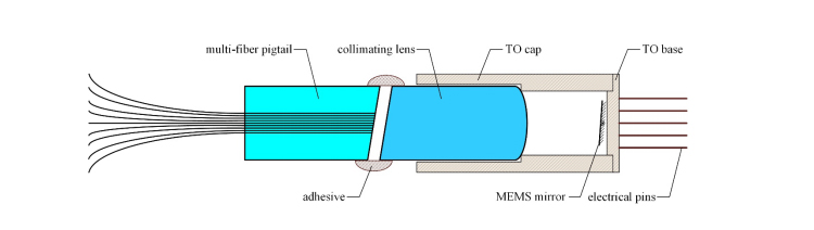 基于MEMS技術(shù)的1×N端口光開關(guān),其結(jié)構(gòu)如圖9所示,它包括一個(gè)MEMS微鏡、一個(gè)準(zhǔn)直透鏡和一個(gè)多纖插針。MEMS微鏡通常貼裝在一個(gè)TO管座上,然后通過TO管帽將準(zhǔn)直透鏡與TO管座組裝成一個(gè)組件,最后在有源調(diào)試狀態(tài)下,將多纖插針與前述組件對(duì)準(zhǔn)并固定在一起。