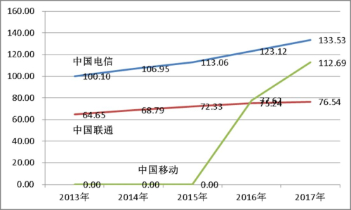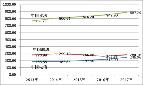 從過(guò)去五年的移動(dòng)用戶數(shù)量變化來(lái)看,中國(guó)移動(dòng)的移動(dòng)用戶數(shù)每年都會(huì)增加2000多萬(wàn),2017年甚至增加了3800多萬(wàn);中國(guó)聯(lián)通則很不穩(wěn)定,一度在2015年、2016年出現(xiàn)大幅下降,2017年才出現(xiàn)了2000多萬(wàn)的增長(zhǎng);中國(guó)電信表現(xiàn)穩(wěn)定,2015年、2016年每年增加1000多萬(wàn),2017年則強(qiáng)勁增加了近3500萬(wàn),幾乎與中國(guó)移動(dòng)的增量齊平。無(wú)論從現(xiàn)有用戶數(shù)還是從絕對(duì)增量來(lái)看,中國(guó)移動(dòng)在移動(dòng)業(yè)務(wù)領(lǐng)域的強(qiáng)勢(shì)并沒(méi)有遇到挑戰(zhàn);中國(guó)電信表現(xiàn)平穩(wěn);而中國(guó)聯(lián)通的形勢(shì)雖有好轉(zhuǎn),但仍然未能從前兩年的頹勢(shì)中徹底恢復(fù)過(guò)來(lái)。如下圖所示(單位:百萬(wàn)戶)