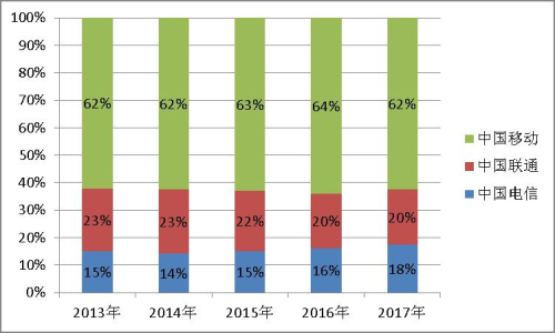 從移動(dòng)用戶市場(chǎng)的份額劃分來(lái)看,中國(guó)移動(dòng)一家獨(dú)大的局面不但沒(méi)有改變,反而愈演愈烈。在過(guò)去幾年間,中國(guó)移動(dòng)的移動(dòng)用戶占比一直在緩慢而穩(wěn)定地上升,只在2017年有一定回調(diào);中國(guó)電信的份額也呈現(xiàn)出穩(wěn)定增加的趨勢(shì),于是中國(guó)聯(lián)通就成了唯一一個(gè)份額不斷萎縮的運(yùn)營(yíng)商。如下圖所示。