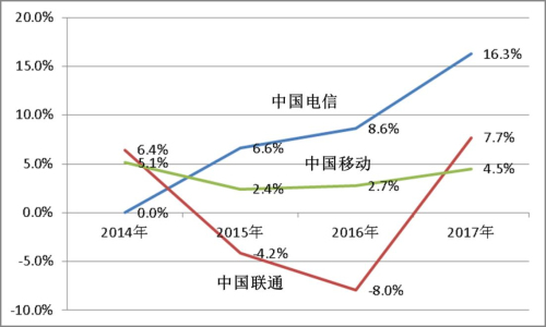 再看移動(dòng)用戶數(shù)的增幅,中國(guó)電信從增幅來(lái)看是最好的,一直呈現(xiàn)穩(wěn)定增長(zhǎng)趨勢(shì),并在2017年實(shí)現(xiàn)了16.3%的增幅;中國(guó)移動(dòng)由于總數(shù)龐大,因此增幅比較平穩(wěn);中國(guó)聯(lián)通則表現(xiàn)得非常不穩(wěn)定,2014年還增長(zhǎng)了6.4%,轉(zhuǎn)眼就變成了-4.2%、-8%,然后又在2017年跳到了7.7%,是不是有點(diǎn)像蹦極?