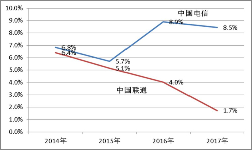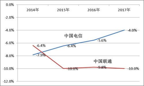 由于中國(guó)移動(dòng)并不開(kāi)展固定電話這個(gè)夕陽(yáng)業(yè)務(wù),所以承受損失的只有中國(guó)電信和中國(guó)聯(lián)通。兩家運(yùn)營(yíng)商的固話用戶數(shù)都在減少,但細(xì)品起來(lái)還是有差異的。比如中國(guó)電信的降幅實(shí)際上是逐漸縮小,從2014年的-7.9%一路縮小到2017年的-4%;中國(guó)聯(lián)通則絲毫看不到改善的跡象,在過(guò)去三年間始終保持著10%左右的下降幅度,如下圖所示。說(shuō)實(shí)話,為什么受傷的總是聯(lián)通?