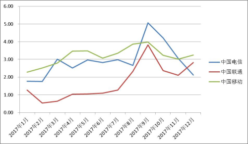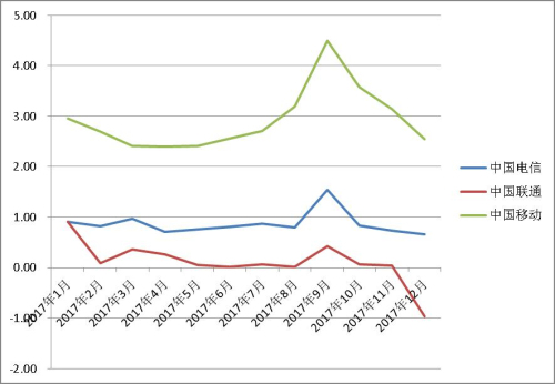 每一年的用戶變化,是由每個(gè)月的用戶變化累積而來(lái)。所以在解析三大運(yùn)營(yíng)商過(guò)去幾年的用戶數(shù)據(jù)情況之后,再來(lái)看看2017年每個(gè)月的情況,大家就可以大致猜出2018年的情況了。