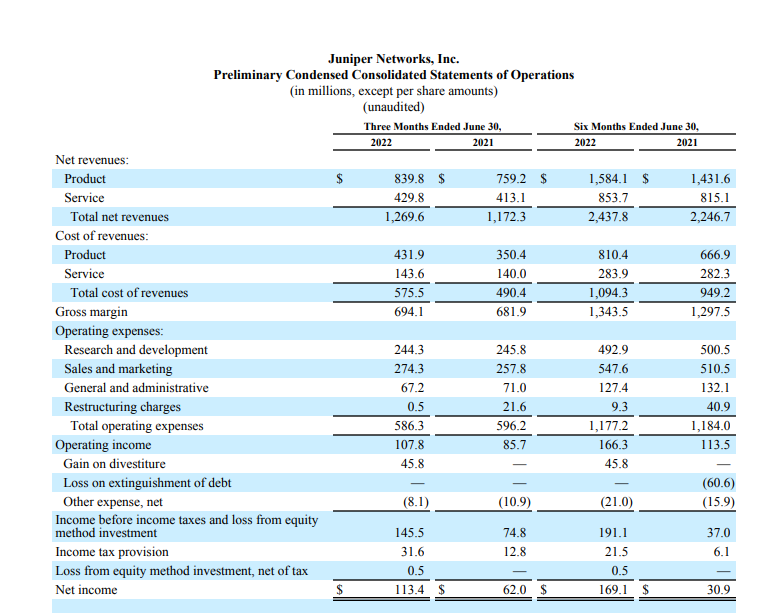 2022年二季度,Juniper銷售收入為12.7億美元,較去年同期增長8%,比上一季度增長9%。凈收入1.13億美元,去年同期凈收入6200萬美元,同比增長83%,較上一季度凈收入增長104%。毛利率為54.67%。非GAAP凈收入為1.36億美元,較去年同期增長3%,較上一季度增長34%。