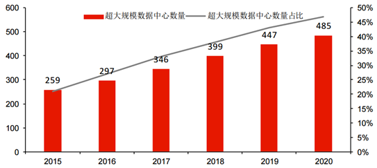 由于數(shù)據(jù)中心及云計(jì)算資源需求的持續(xù)增長(zhǎng),帶動(dòng)了超大規(guī)模公有云數(shù)據(jù)中心的發(fā)展。據(jù)思科全球云服務(wù)指數(shù)(Cisco Global Cloud Index)預(yù)測(cè),全球超大規(guī)模數(shù)據(jù)中心的數(shù)量預(yù)計(jì)將從2016年底的300個(gè)增加到2020年的485個(gè);同時(shí)超大數(shù)據(jù)中心占所有數(shù)據(jù)中心服務(wù)的份額將從2015年的21%增長(zhǎng)到2020年 47%。