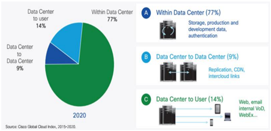 根據(jù)思科云計(jì)算白皮書(shū)顯示,2020年數(shù)據(jù)中心內(nèi)部數(shù)據(jù)流量將成為與數(shù)據(jù)中心相關(guān)流量主體,占比達(dá)到 77%;而數(shù)據(jù)中心之間流量占數(shù)據(jù)中心所有流量的9%,數(shù)據(jù)中心與用戶(hù)之間的數(shù)據(jù)流量只有所有流量的14%。網(wǎng)絡(luò)架構(gòu)的改變帶動(dòng)數(shù)據(jù)中心橫向流量的增加,也即對(duì)應(yīng)的數(shù)據(jù)中心內(nèi)部互聯(lián)的需求持續(xù)上升。