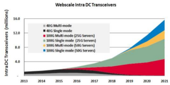 而隨著超級(jí)數(shù)據(jù)中心建設(shè)步伐加快、數(shù)據(jù)中心連接速率升級(jí),也不斷推動(dòng)高速光模塊需求的高速增長(zhǎng)。根據(jù)市場(chǎng)調(diào)研公司ovum提供的數(shù)據(jù)顯示,100G單模/多模產(chǎn)品未來(lái)會(huì)成為數(shù)據(jù)中心內(nèi)部高速光模塊主流產(chǎn)品,全球需求量預(yù)計(jì)將從2015年接近空白增長(zhǎng)到2021年近1600萬(wàn)個(gè),作為過(guò)渡產(chǎn)品的40G模塊將逐步被替代。