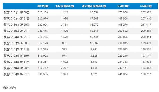 ICCSZ訊 12月21日上午消息,中國移動公布了2015年11月份運營數(shù)據(jù)。數(shù)據(jù)顯示,中國移動用戶總數(shù)達8.25188億戶,4G用戶本月新增2001.3萬戶,4G用戶總數(shù)達2.87323億戶。3G用戶本月再減少816.8萬戶。