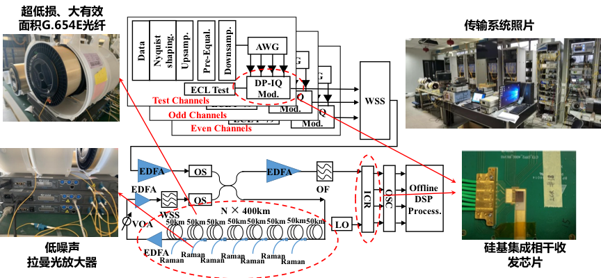 該實驗由中國信科集團光纖通信技術(shù)和網(wǎng)絡國家重點實驗室聯(lián)合鵬城實驗室、國家信息光電子創(chuàng)新中心、烽火通信和光迅科技等單位共同完成。實驗基于合作單位自主研制的超低損耗、超大有效面積光纖、低噪聲拉曼光放大器件以及硅基集成相干收發(fā)器等關鍵器件和模塊,采用新型數(shù)字預均衡技術(shù)結(jié)合Nyquist整形技術(shù)及自適應、可編程的光域信道均衡算法,完成了80×200Gbit/s DWDM Nyquist整形DP-QPSK光信號10000公里標準單模光纖傳輸系統(tǒng)實驗。
