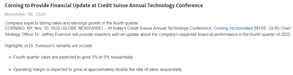ICC訊(編譯:Nina)美國紐約州康寧市,2020年11月30日--在今天的瑞士信貸年度技術(shù)會議上,康寧公司(紐交所:GLW)首席戰(zhàn)略官Jeffrey Evenson博士提供了關(guān)于2020年第四季度財務(wù)預(yù)期的最新信息。
