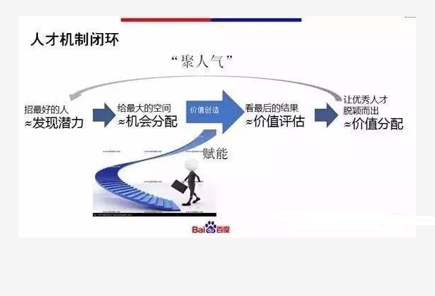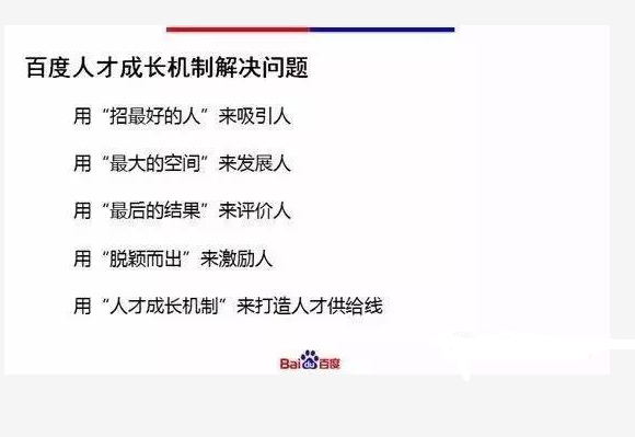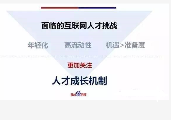 而站在互聯(lián)網(wǎng)尤其像百度,我感覺(jué)人才矛盾點(diǎn)更多集中在高大上那邊的事情,也就實(shí)說(shuō)我們其實(shí)更多會(huì)去看人才成長(zhǎng)機(jī)制。進(jìn)入互聯(lián)網(wǎng)時(shí)代人才競(jìng)爭(zhēng)非常激烈,在兩三年前我們創(chuàng)始人CEO跟我們說(shuō),他說(shuō)資本的話語(yǔ)權(quán)在讓位于知本,從capitalism 轉(zhuǎn)向 talentism。這個(gè)詞我們的感受還是很深刻的,如果一些比較厲害的人能夠?yàn)槟闼茫鋵?shí)給公司和社會(huì)帶來(lái)的價(jià)值是非常大的,這是剛才說(shuō)比較高大上的部分。