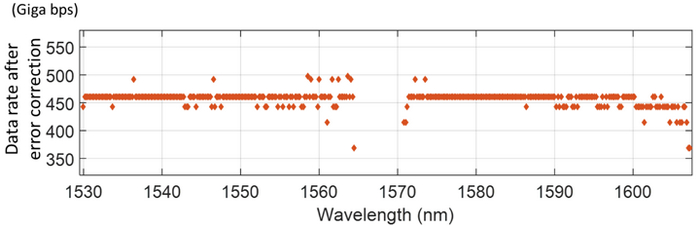 2、圖2中的實(shí)驗(yàn)結(jié)果圖顯示了應(yīng)用糾錯(cuò)碼來(lái)優(yōu)化總吞吐量。 雖然許多編碼速率是統(tǒng)一的,但單個(gè)通道可以使用最佳糾錯(cuò)碼來(lái)實(shí)現(xiàn)每秒159 Terabits的總數(shù)據(jù)吞吐量。