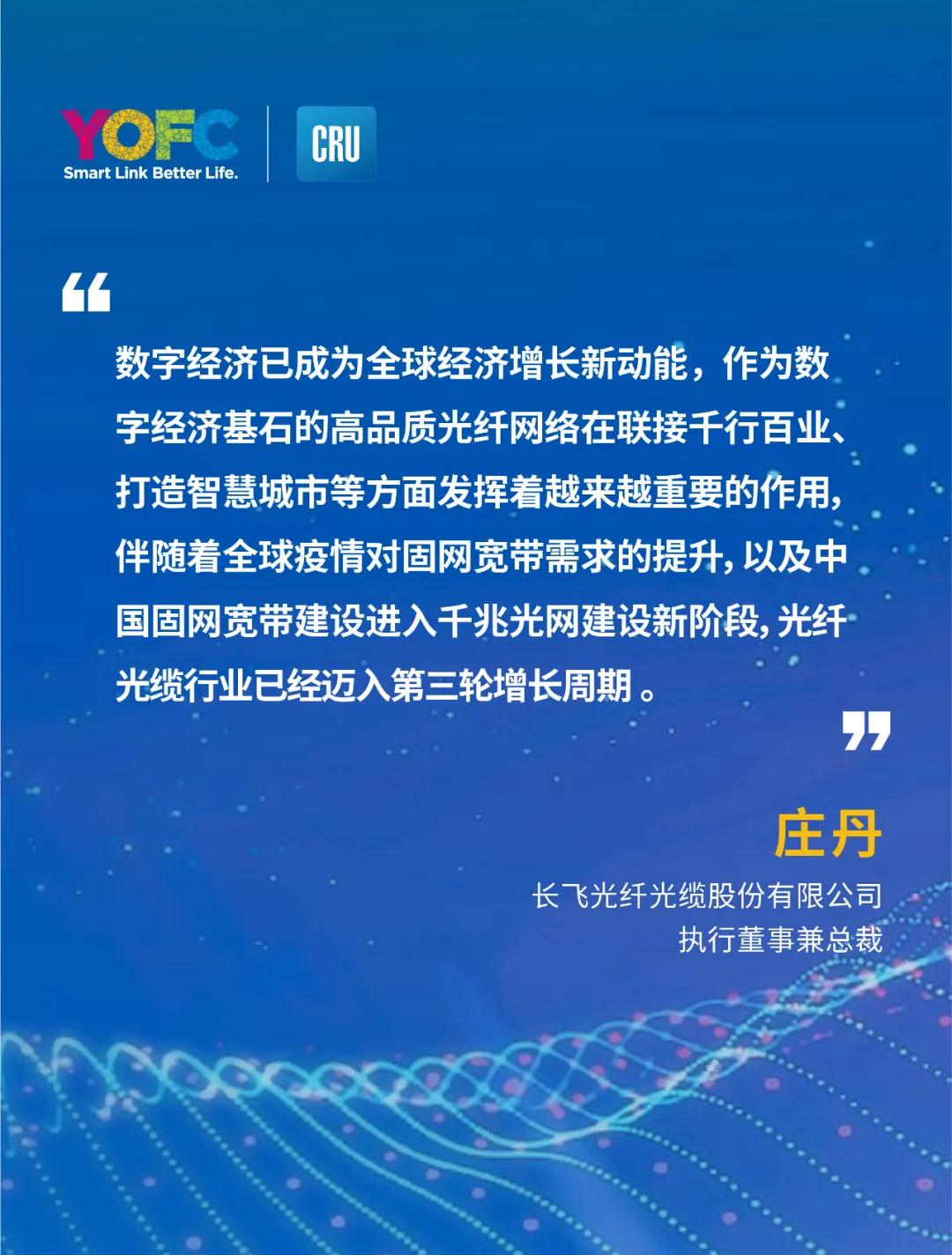 自2015年起,長(zhǎng)飛公司已聯(lián)合世界權(quán)威咨詢機(jī)構(gòu)CRU(英國(guó)商品研究所)舉辦多屆世界光纖光纜大會(huì),并成為大會(huì)長(zhǎng)期的合作伙伴,2021年是長(zhǎng)飛深度參與CRU世界光纖光纜大會(huì)、與國(guó)際行業(yè)巨頭共話產(chǎn)業(yè)發(fā)展的第七年,充分體現(xiàn)了CRU對(duì)長(zhǎng)飛公司全球光纖光纜行業(yè)領(lǐng)導(dǎo)地位的高度認(rèn)可。
