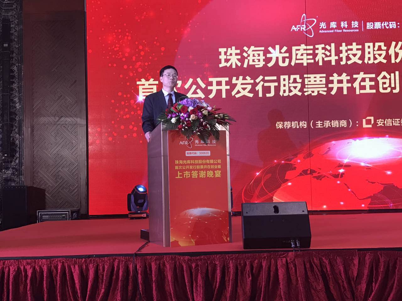 接下來是光庫總經(jīng)理王興龍發(fā)表致辭,首先王總對各位嘉賓的到來表示熱烈的歡迎和感謝。并闡述了17年來光庫科技一步一個腳印成長的艱辛,也感謝了珠海高新區(qū)政府、公司管理團隊、員工以及安信證券對光庫發(fā)展與上市的幫助和支持。