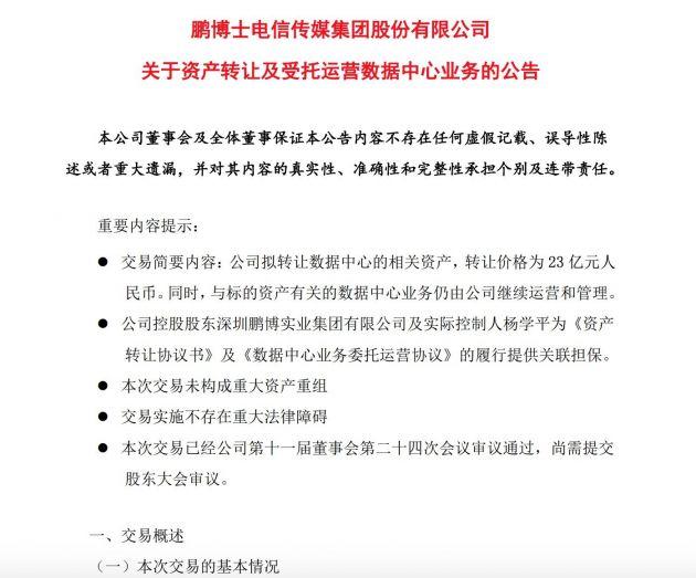 4月28日消息,鵬博士發(fā)布關于資產轉讓及受托運營數據中心業(yè)務的公告,擬向平盛國際金融控股有限公司、錦泉元和投資管理有限責任公司轉讓數據中心的相關資產,轉讓價格為23億元人民幣。同時,與標的資產有關的數據中心業(yè)務仍由公司繼續(xù)運營和管理。