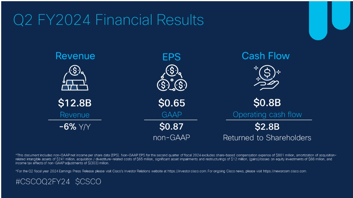 ICC訊(編譯:Vicki)思科公布了截止到2024年1月27日的2024財年第二季度的財務(wù)業(yè)績。