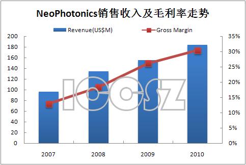 NeoPhotonics公司2010年?duì)I收1.84億美元,比2009年增長了2910萬美元漲幅為19%。 2010年毛利潤率從2009年的26.1%提高到30.4%。該公司還公布2010年首次全年盈利。比起2009年680萬美元的凈虧損,2010年公司凈利潤為330萬美元。2010年,歸屬于公司普通股股東的攤薄每股收益(虧損)為0.00美元,而2009年為3.72美元。