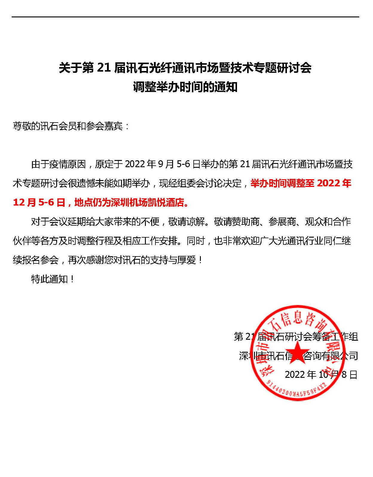 由于疫情原因,原定于2022年9月5-6日舉辦的第21屆訊石光纖通訊市場(chǎng)暨技術(shù)專(zhuān)題研討會(huì)很遺憾未能如期舉辦,現(xiàn)經(jīng)組委會(huì)討論決定,舉辦時(shí)間調(diào)整至2022年12月5-6日,地點(diǎn)仍為深圳機(jī)場(chǎng)凱悅酒店。