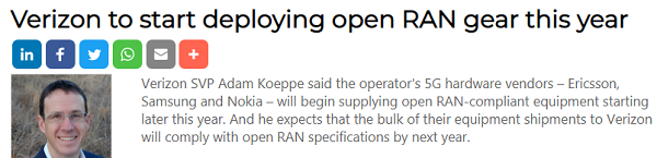ICC訊(編譯:Nina)Light Reading消息,Verizon高級副總裁Adam Koeppe表示,該運(yùn)營商的5G硬件供應(yīng)商--愛立信、三星和諾基亞--將在今年晚些時候開始提供Open RAN兼容設(shè)備。他預(yù)計(jì)到明年,這些供應(yīng)商向Verizon供應(yīng)的大部分設(shè)備都將符合Open RAN標(biāo)準(zhǔn)。