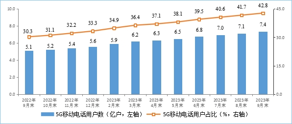移動(dòng)電話(huà)用戶(hù)數(shù)穩(wěn)步增長(zhǎng),5G用戶(hù)規(guī)模加速擴(kuò)大。截至9月末,三家基礎(chǔ)電信企業(yè)的移動(dòng)電話(huà)用戶(hù)總數(shù)達(dá)17.23億戶(hù),比上年末凈增3933萬(wàn)戶(hù)。其中,5G移動(dòng)電話(huà)用戶(hù)達(dá)7.37億戶(hù),比上年末凈增17654萬(wàn)戶(hù),占移動(dòng)電話(huà)用戶(hù)的42.8%,占比較上年末提高9.5個(gè)百分點(diǎn)。