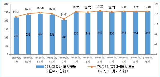 移動(dòng)互聯(lián)網(wǎng)流量增速小幅提升,9月DOU值達(dá)17GB/戶(hù)。前三季度,移動(dòng)互聯(lián)網(wǎng)累計(jì)流量達(dá)2188億GB,同比增長(zhǎng)14.9%,增速較上半年提升0.3個(gè)百分點(diǎn)。截至9月末,移動(dòng)互聯(lián)網(wǎng)用戶(hù)數(shù)達(dá)15.1億戶(hù),比上年末凈增5471萬(wàn)戶(hù)。9月當(dāng)月戶(hù)均移動(dòng)互聯(lián)網(wǎng)接入流量(DOU)達(dá)到17.01GB/戶(hù)·月,同比增長(zhǎng)13.4%,較上年12月份高0.83GB/戶(hù)·月。