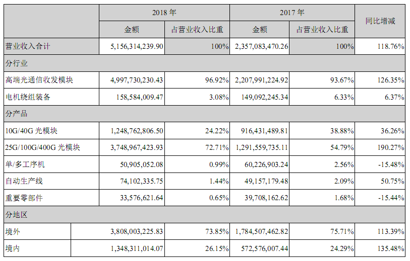 分產(chǎn)品來看,10G/40G光模塊營(yíng)收12.49億元,同比增長(zhǎng)36.26%,毛利率24.36%,占總營(yíng)收24.22%;25G/100G/400G光模塊營(yíng)收37.49億元,同比增長(zhǎng)190.27%,毛利率28.16%,占總營(yíng)收72.71%。國(guó)內(nèi)外營(yíng)收占比分別為73.85%和26.15%。2018年,高端光通信收發(fā)模塊總生產(chǎn)450萬只,總銷售出貨422萬只。