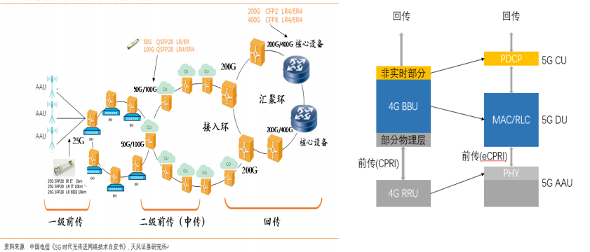 5G網(wǎng)絡(luò)所提供的多類業(yè)務(wù)的主要特征包括大帶寬、低延時(shí)、海量連接等從而對(duì)承載網(wǎng)提出了大寬帶、低延時(shí)、高精度時(shí)間同步、靈活組網(wǎng)、網(wǎng)絡(luò)切片的要求。5G承載網(wǎng)將從4G時(shí)期的兩級(jí)結(jié)構(gòu)演化到三級(jí)結(jié)構(gòu),衍生出前傳、中傳和回傳網(wǎng)絡(luò)三部分。同時(shí),5G網(wǎng)絡(luò)頻譜相對(duì)4G網(wǎng)絡(luò)更高,造成基站密度大幅增加。由此衍生,5G網(wǎng)絡(luò)的建設(shè)相較4G時(shí)代提升了對(duì)光模塊產(chǎn)品的數(shù)量需求、速率要求,要求的傳輸距離也會(huì)越來越遠(yuǎn)。目前5G前傳網(wǎng)絡(luò)以25G光模塊產(chǎn)品為主;中傳或以50G PAM4為主;5G回傳或?qū)⑹褂?00G/200G/400G相干光模塊(高速長(zhǎng)距)。據(jù)公開資料及中信建投證券研究報(bào)告預(yù)計(jì),中國(guó)5G光模塊市場(chǎng)規(guī)模預(yù)計(jì)將達(dá)到550億元,較4G時(shí)代180億元投資額增長(zhǎng)206%。