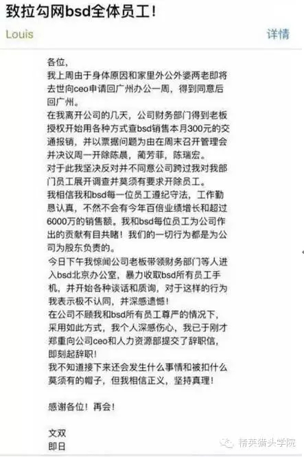 12月29日消息,今天拉勾網(wǎng)副總裁文雙發(fā)內(nèi)部信表示,不滿公司跨過其對其部門員工展開調(diào)查并莫須有要求開除員工,已向公司CEO和人力資源部提交了辭職信,即刻辭職。