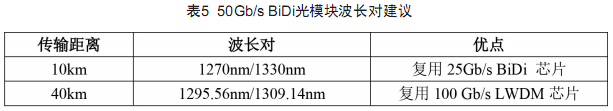 50Gb/s光模塊的典型傳輸距離在40km及以內(nèi),技術(shù)方案主要基于25G波特率的光芯片和脈幅調(diào)制(PAM4)調(diào)制格式,對(duì)高線性度激光器驅(qū)動(dòng)器和跨阻放大器要求較高。目前IEEE 802.3cd已經(jīng)規(guī)范了傳輸距離為10km的單通道50Gb/s光接口,IEEE802.3cn正在規(guī)范傳輸距離為40km的50Gb/s光接口。50Gb/s 10km光模塊可采用25G波特率的DFB激光器和PIN探測(cè)器實(shí)現(xiàn);40km光模塊需采用25G波特率的EML激光器和APD探測(cè)器實(shí)現(xiàn)。對(duì)上下行時(shí)延對(duì)稱性要求較高的應(yīng)用場(chǎng)景可采用50Gb/s BiDi光模塊,相關(guān)標(biāo)準(zhǔn)IEEE 802.3cp正在規(guī)范,擬采用WDM技術(shù)方案,結(jié)合方案成本與供應(yīng)鏈成熟度考慮,具體波長(zhǎng)對(duì)選擇建議如表5所示。