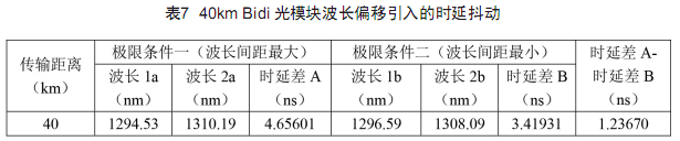 40km BiDi光模塊由于激光器采用溫度控制,波長(zhǎng)偏移范圍略小,時(shí)延差最大變化量為1.23670ns,如表7所示。