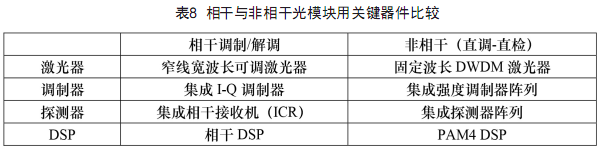 非相干DWDM彩光模塊的典型傳輸距離為40km及以內(nèi),目前主流方案采用PAM4技術(shù)。非相干50/100Gb/s光模塊采用固定波長(zhǎng)DWDM激光器和PAM DSP芯片,相對(duì)于相干光模塊具有一定的成本優(yōu)勢(shì),兩者關(guān)鍵器件的比較如表8所示。
