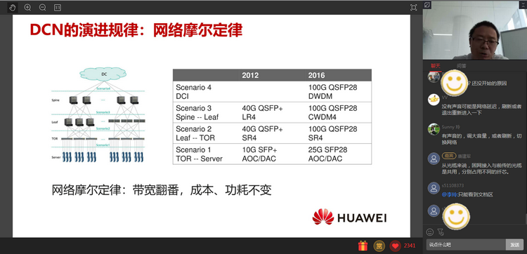 其中,華為數(shù)通產(chǎn)品線產(chǎn)品規(guī)劃專家謝耀輝博士發(fā)表了主題為《DCN最新發(fā)展情況與趨勢(shì)》的演講,提到DCN的演進(jìn)規(guī)律與未來(lái)趨勢(shì),并提出服務(wù)器接入“光退銅進(jìn)”的新概念,指出AOC正面臨變局,OTT通過(guò)單聯(lián)柜和雙聯(lián)柜在向低成本、低功耗、低時(shí)延的DAC轉(zhuǎn)變。對(duì)于未來(lái)趨勢(shì),謝博士認(rèn)為,400GE是DCN演進(jìn)的大代;接入需要DSFP小型化封裝;產(chǎn)業(yè)需聚焦,這樣才可能上量,把成本和功耗的競(jìng)爭(zhēng)力做出來(lái)。在演講結(jié)束還解答了觀眾的熱烈提問(wèn),觀看直播才能收獲全部信息,歡迎關(guān)注訊石每一次的線上線下會(huì)議活動(dòng)。